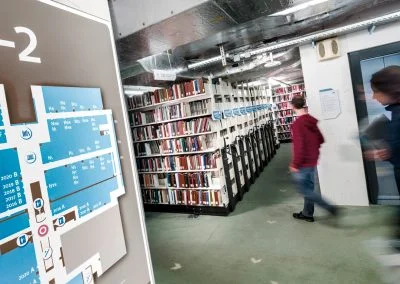 Das Orientierungssystem haben wir als rein analoges System konzipiert und produziert. Zu den Vorgaben für die Entwicklung gehörten: Verwendung des bestehenden Corporate Designs, kein Eingriff in Wand / Boden / Decke und eine Inhouse-Bewirtschaftung des Systems durch die Zentralbibliothek.